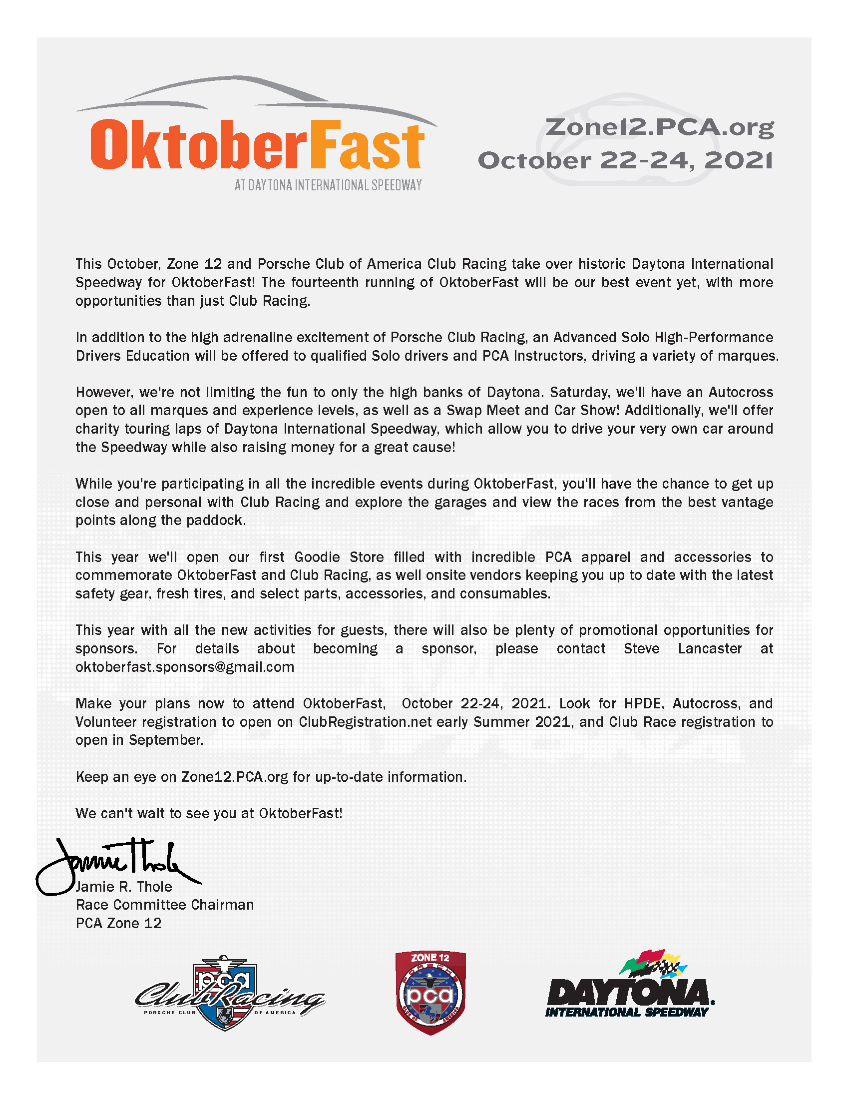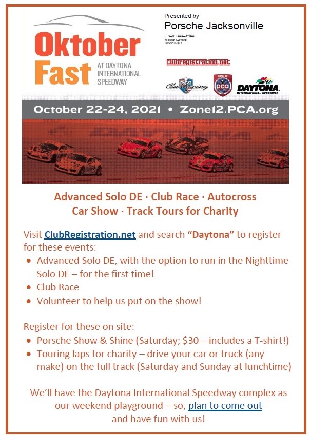 Come join us at the legendary Daytona International Speedway, October 27 thru 29 and race in the PCA Zone 12 Daytona OktoberFast Club Race.
